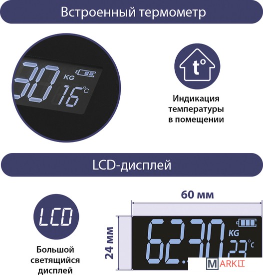 Функциональные особенности расчет доли воды, расчет доли жировой ткани, расчет доли мышечной ткани, расчет доли костной ткани, расчет ИМТ (BMI), индикация температуры помещения, индикация заряда батареи